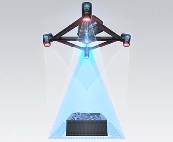 3Dロボットビジョンシステム「CV-X480D」は、異なる角度から4つのカメラで撮像することで、死角のない安定した3次元画像の生成が可能です。そのほかにも高精細CMOSセンサや高速プロセッサ、専用設計プロジェクターを搭載することで、高精度かつ高速で、ロバスト性に優れたワークの検出を実現しています。