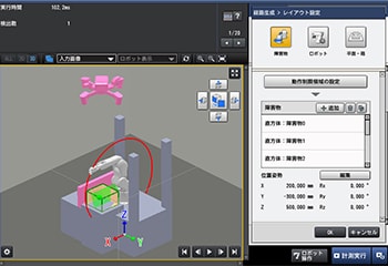 3Dロボットビジョンシステム「CV-X480D」は、パソコン上でシミュレーションができる「経路生成ツール」や「ピッキングシミュレーター」を搭載しています。経路生成ツールで環境レイアウトを設定すれば、障害物を避けながら最適な経路を自動算出可能です。ロボットや箱、障害物の配置に加え、ワークの把持位置なども画面上でティーチングでき、すべてマウス操作のみで完結するので、事前知識がなくても扱えるところも特長です。