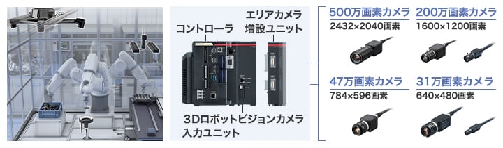 キーエンスの3Dロボットビジョンシステム「CV-X480D」は、3Dロボットビジョンカメラのほか、エリアカメラ増設ユニットを追加することで、20種類のカメラから最大2種類を自由に追加できます。これによって、3Dロボットビジョンシステムでばら積みピッキングを行い、エリアカメラ(2Dロボットビジョンシステム)でつかみずれ補正や品種判別、プレース位置ずれ補正などを行うといった使い方も可能です。このように3Dロボットビジョンシステムとエリアカメラを組み合わせて使えば、より高精度かつ別の作業を同時に実施することが可能です。こういった発展性の高さもキーエンスの3Dロボットビジョンシステムの魅力です。