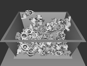 3Dロボットビジョンシステム「CV-X480D」は、専用の物理エンジンでリアルなばら積み状態を再現可能。実際のワークや箱を用意せず、パソコン上で物理シミュレーションができます。パソコン上で現場に近いシミュレーションができるので、実設備を用意する手間も削減できます。