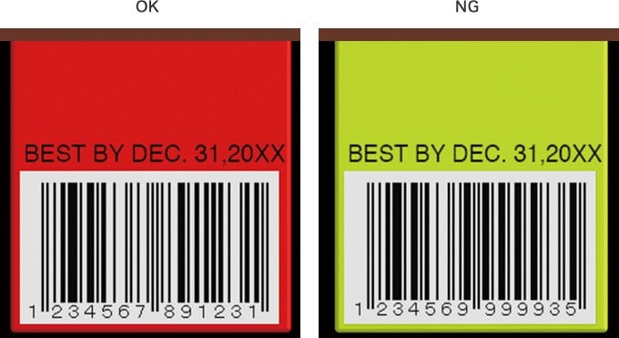 シュリンクフィルムには、パッケージデザインのほか賞味期限などが印字されています。印字ズレ、印字違いなどは、印字機器の設定ミスといった人為的トラブルのほか、ボトルの位置ズレや機械の誤作動など、さまざまな要因が考えられますので、防止策としては画像処理システムによる全数検査が有効です。近年では、画像処理技術やOCR(文字認識)技術の発達により、高速ラインでも停止せずに文字の読み取りが可能です。
