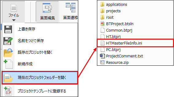 プロジェクトフォルダーは、BT開発・運用ツール 右上の「ファイル」→「現在のプロジェクトフォルダーを開く」にて開くことができます。