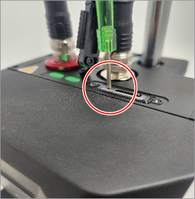 [IP RESET]ボタンに細い棒状のピンを差し込み、レーザー放射LEDが0.5秒周期で緑点滅するまで押し込みます。
