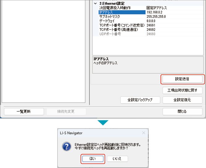 - [設定送信]を押すとヘッドを再起動するかどうかのメッセージが表示されるので、[はい]を選択します。