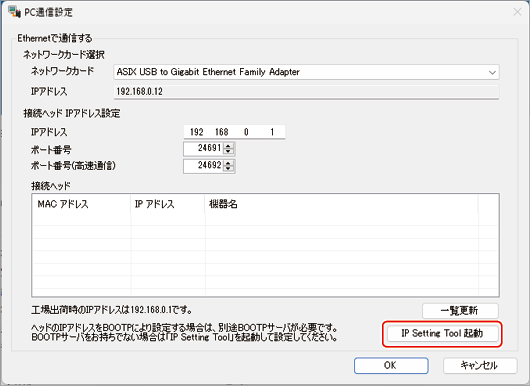 - IP Setting Tool画面が表示されるので、一覧からヘッドを選択し[IPアドレス設定]をクリックします。