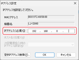 - 空いているIPアドレスが見つかったら[IPアドレス(必須)]欄に入力して、[OK]をクリックします。
