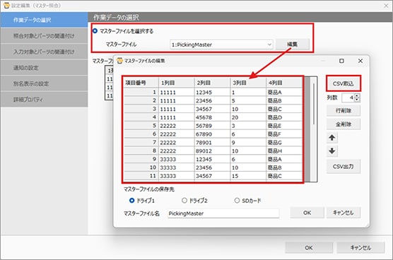 例)作業No、品番、数量、品名のマスターファイルを用意します。