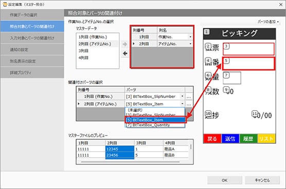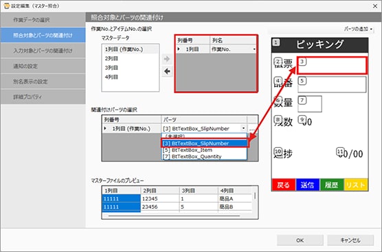 「照合対象とパーツの関連付け」でマスターデータ(作業No)の参照する列と画面上の入力箇所を指定します。