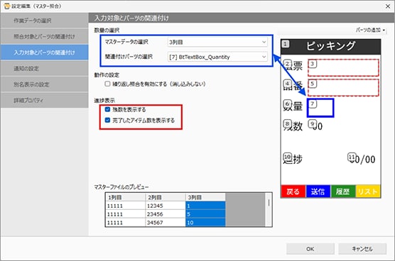 「入力対象とパーツの関連付け」でマスターデータ(数量)が参照する列と画面上の入力箇所を指定します。