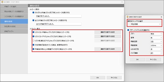 「通知の設定」で消し込み完了時やエラー時の動作を指定します。