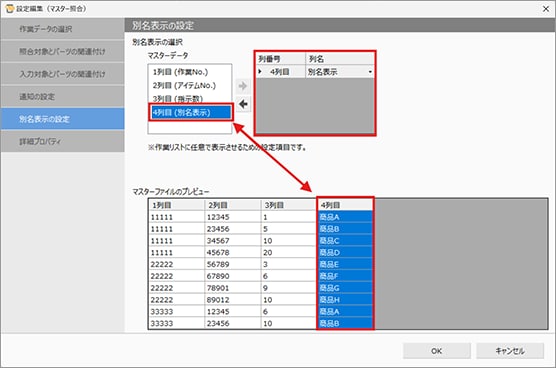 残リストに商品名を表示したい場合はマスターファイルの列を追加し、「別名表示の設定」で紐づけをしてください。