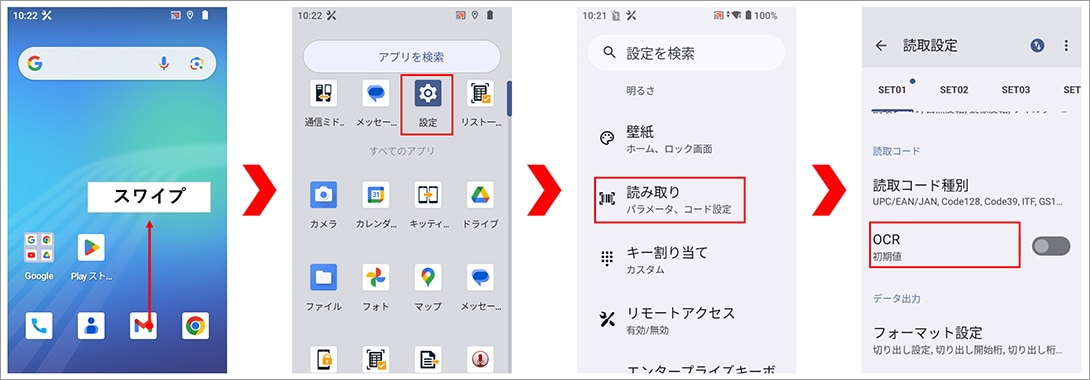 ハンディターミナルのホーム画面で下から上にスワイプし、「設定」アプリを起動して、読み取り→OCRに進んでください。
