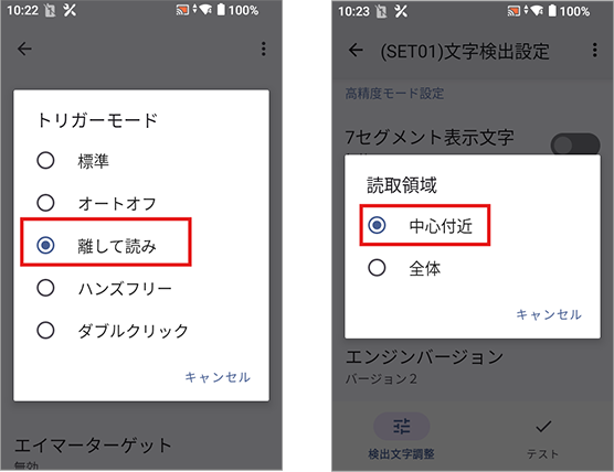 読み取りしたい文字を狙って読んだり、カメラの視野が広く読みたいところを読めない場合は、「離して読み」と「中心付近」の設定をしてください。
