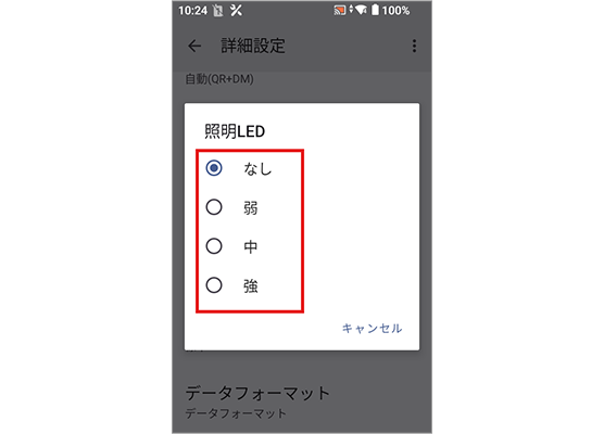 液晶越し、ラップ越し、などで読み取しづらい場合や読み取る場所が暗い場合は、読み取り時の「照明」を調整してください。
