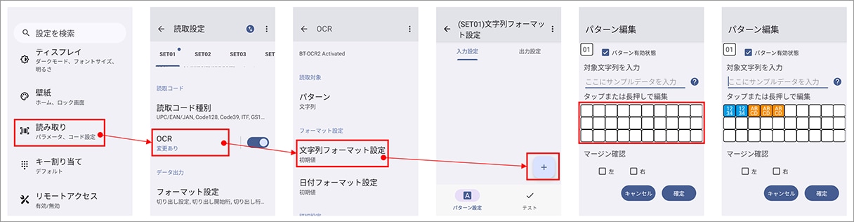 「設定」アプリから「読み取り」→「OCR」→「文字列フォーマット」に進んで、「+」ボタンを押してください。 白色の枠をタップ、もしくは長押しするとフォーマット登録の編集が可能です。